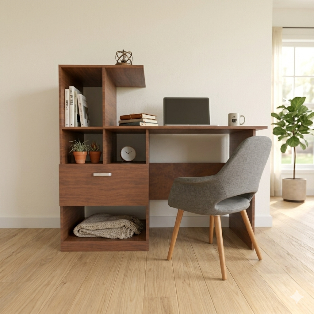 Su diseño vertical permite exhibir libros, plantas, fotografías u objetos decorativos de forma armoniosa, convirtiendo cada elemento en parte de la decoración. El contraste de acabados tipo madera aporta un toque elegante y actual, ideal para salas, dormitorios, estudios u oficinas.